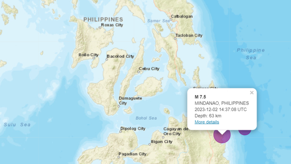 The European-Mediterranean Seismological Centre (EMSC) reports that an earthquake of a magnitude of 7.5 struck Mindanao, Philippines, on Saturday, December 2. As per the assessment by EMSC, the seismic event transpired at a depth of 63 km (39 miles). The American tsunami warning system quickly sent out a tsunami alert after the earthquake.