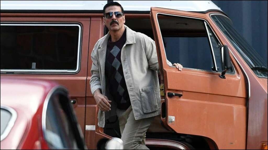 Akshay’s retro look is quite fascinating. With brown pants and a white collared t-shirt with a black jacket, the actor is looking too cool. Especially after he got out of a vintage car.