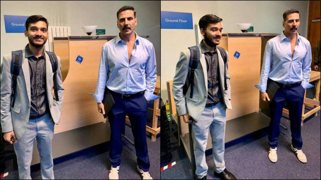 Akshay changed his pants from brown to blue, while posing with another male fan this time.