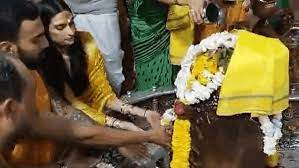 Newlyweds Athiya Shetty and KL Rahul, visited the Mahakaleshwar temple in Ujjain, Madhya Pradesh. Pictures from the visit fleeted online, wherein the couple is seen offering prayer. Athiya is seen in a mustard saree while KL chose a cream colored outfit.
