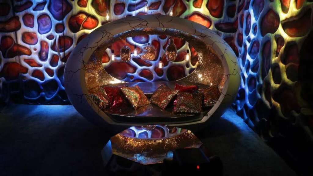 The confession room this time will take to to the outer space. Cracked egg-shaped seating right in the center with overflowing sparkly upholstery. Will make you catch your breath. And is considered as one of the most dramatic spaces of the house.