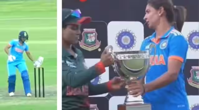 The first incident happened precisely when Kaur whacked the wickets with her bat in a fit of rage after being dismissed for being caught at slip by spinner Nahida Akter in the 34th over of India’s batting.