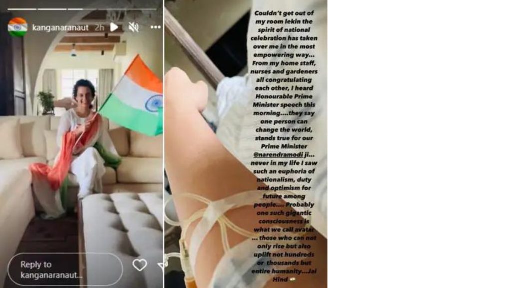 In the first video, Kangana can be seen sitting on her sofa with Indian flag in her hand and penned, “Happy Independence Day to all”. Her next Instagram Stories shows a photo of her in bed, with a cannula in her arm. She penned, “Couldn’t get out of my room lekin the spirit of national celebration has taken over me in the most empowering way. From my home staff, nurses and gardeners all congratulating each other, I heard Honourable Prime Minister speech this Morning.”