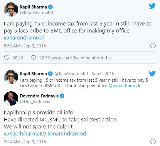 In 2016, Kapil Sharma complained to Narendra Modi about corruption. He had tweeted and said “I have been paying Rs 15 crore tax since last five years. But I have to bribe BMC 5 lakhs for making my office.” Are these good days? After Kapil’s comments, Maharashtra CM Devendra Fadnavis said that give full information.