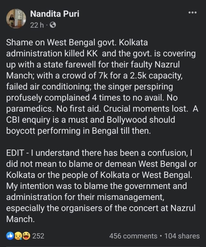 On Facebook, she wrote: “Shame on West Bengal. Kolkata killed KK and the govt. is covering up with a state farewell for their faulty Nazrul Manch; with a crowd of 7k for a 2.5k capacity, failed air conditioning; the singer perspiring profusely complained 4 times to no avail. No paramedics.