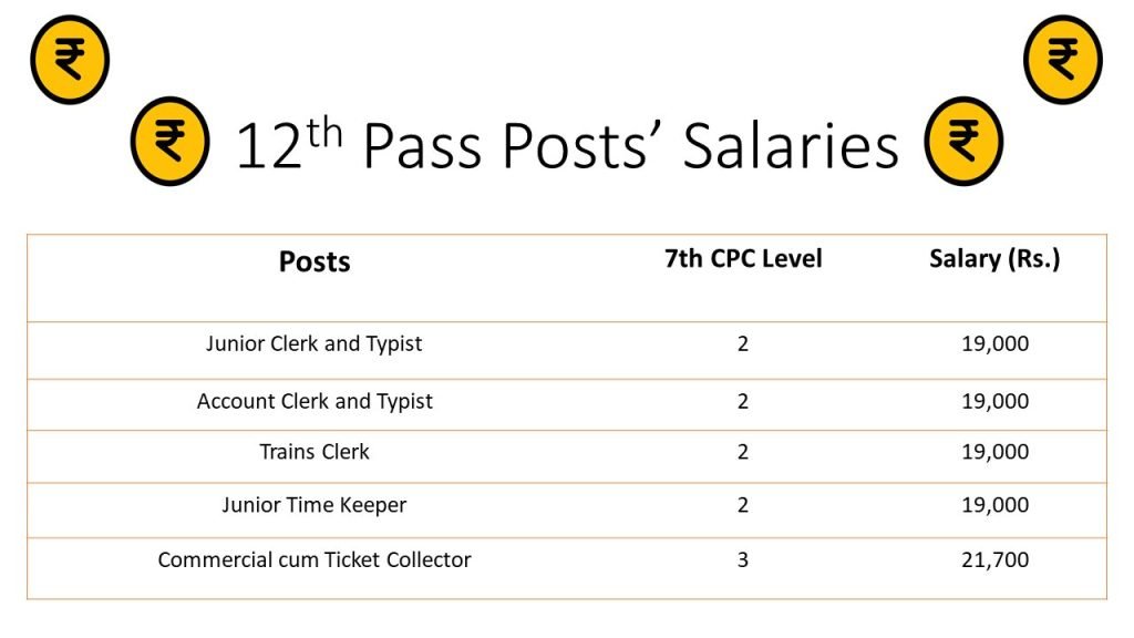 - Train Clerk – 7th CPC Level: 2, Qualification: 10 + 2 or equivalent diploma with an aggregate of at least 50% or above.