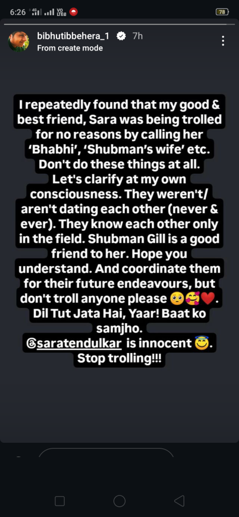“I repeatedly found that my good & best friend, Sara was being trolled for no reasons by calling her ‘Bhabhi’, ‘Shubman’s wife’ etc. Don’t do these things at all. Let’s clarify at my own consciousness. They weren’t/ aren’t dating each other (never & ever). They know each other only in the field. Shubman Gill is a good friend to her. Hope you understand. And coordinate them for their future endeavours, but don’t troll anyone please. Dil Tut Jata Hai, Yaar! Baat ko samjho. Sara Tendulkar is innocent. Stop trolling!!!”