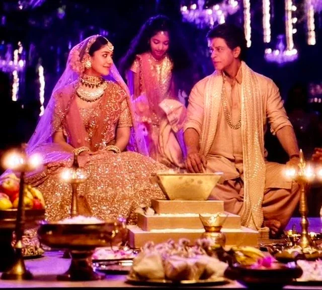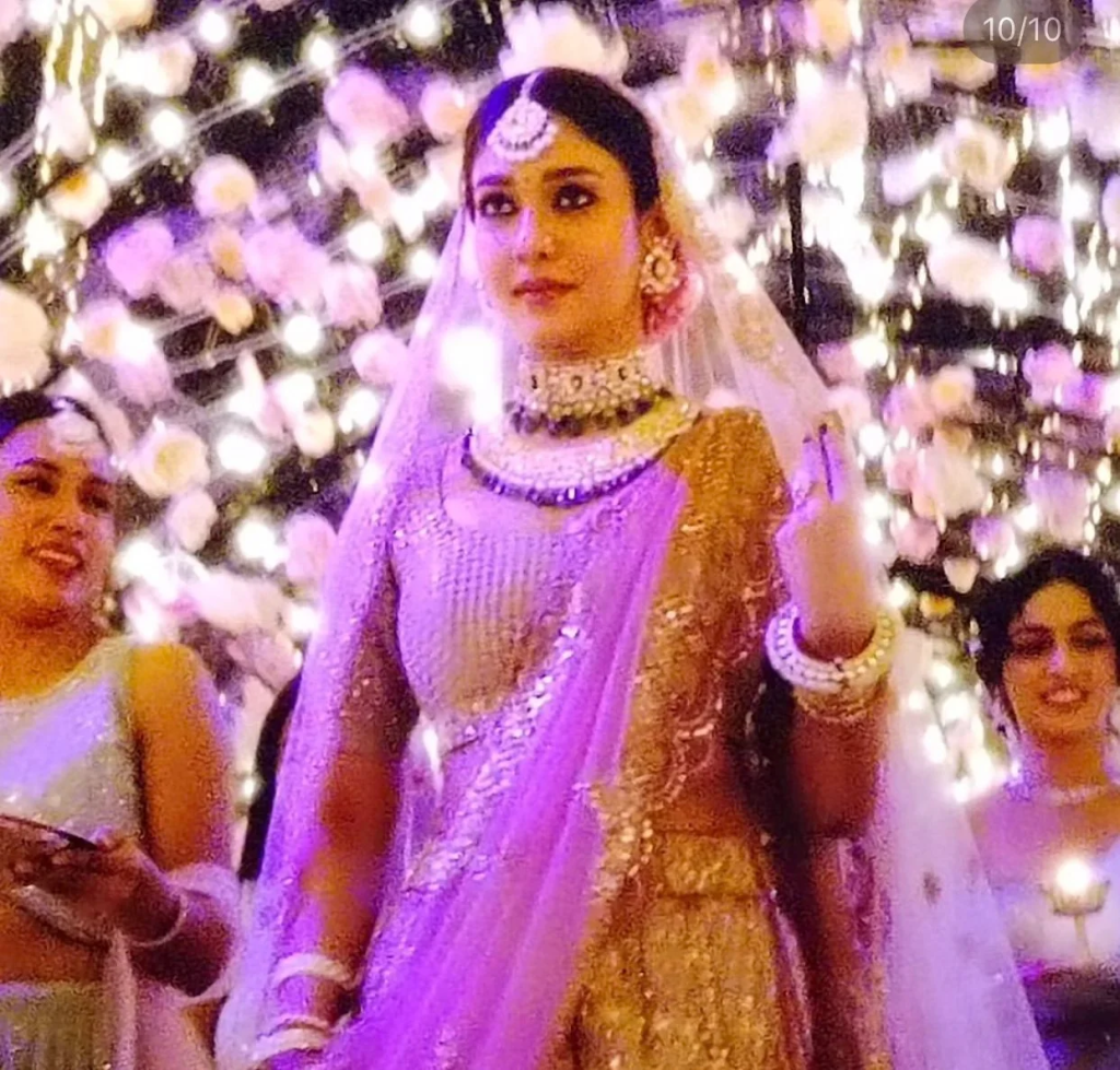 Almost every female in the world has fantasized about seeing Shah Rukh Khan’s dashing mug waiting for her at the altar. For this once-in-a-lifetime occasion, Nayanthara’s wedding attire in Jawan (2023) provides countless ideas. The star enhanced the femininity of the ensemble with a maximalist approach to jewelry, including an emerald-studded choker layered over a larger neckpiece, statement kadas, earrings, and a maang tikka draped over a bun covered in flowers, as she confidently walked down the aisle in a metallic lehenga with an ephemeral veil.