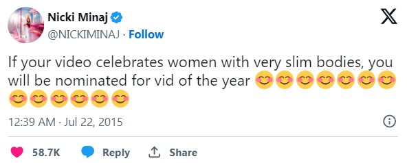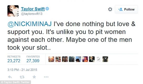 Now, this one was a bit of a head-scratcher, even by Taylor Swift’s standards. When Nicki Minaj took to Twitter to call out the VMAs for snubbing her “Anaconda” video in the nominations, Taylor assumed she was being shaded and fired back with a tweet of her own.